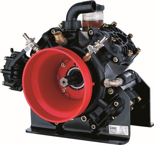 Μεμβρανοφόρα αντλία υψηλής πίεσης, με κεφαλές αλουμινίου, προστασία καρδανικού άξονα και το νέο, ιδιαίτερα ανθεκτικό στα χημικά, διάφραγμα BLUEFLEX. Άκρο άξονα καρέ και από τις δύο πλευρές της αντλίας.